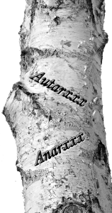 Alicia hesitated only a moment before jogging after the gray creature. It wouldn’t do to lose sight of the only thing that knew its way around this bleak landscape. The creature became harder to spot, a gray blur in the silvery, grassy field through which they ran. She slowed her pace as they approached one of the white trees. She noticed two dark, beautifully carved inscriptions on the trunk: Autarxxx and Anarxxx. “What is this?”